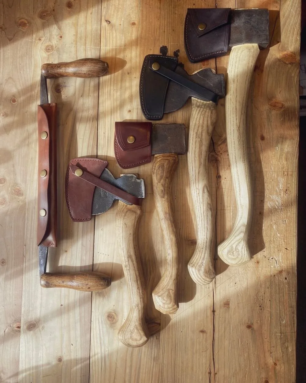 Commissioned to create simple yet elegant and practical sheath covers for a collection of vintage axes, each carefully restored with new ash handles. Using oak bark–tanned leather, known for its durability and rich natural finish, I handcrafted each sheath to precisely fit the unique shape and size of each axe head. The result is a collection of bespoke sheaths that not only protect the blades but also complement the craftsmanship of the restored tools, combining function with timeless style.